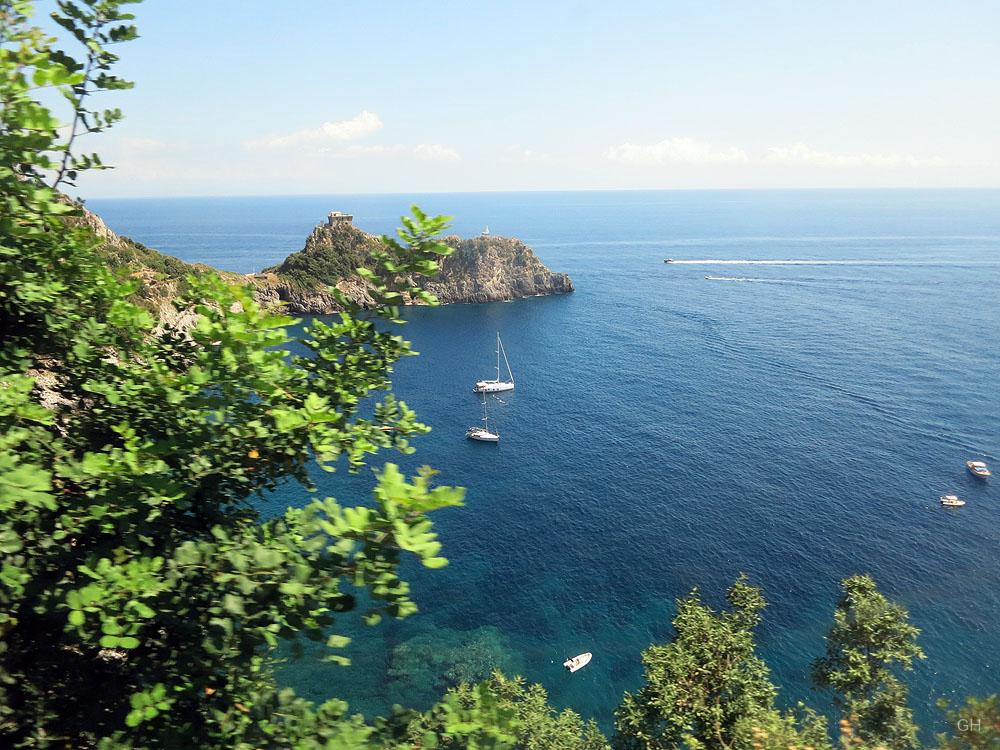 Nach einer Stunde zeigt sich der erste bedeutende Hafen der ehemaligen Seerepublik Amalfi. Positano schlängelt sich, gleich einem surrealen Traumbild, die steilen Abhänge der Monti Lattari („Milchberge“) hoch, gerade so, als ob der Ort die typische vertikale Perspektive einer süditalienischen oder alpenländischen Weihnachtskrippe imitieren wollte. Treppen und Gässchen durchziehen den pittoresken Ort, der von Zitronen- und Orangenhainen umgeben ist. Die Natur ist auch im Hochsommer überraschend grün. Hier trifft sich die Highsociety der Welt. Es ist Italien wie aus dem Reiseprospekt.