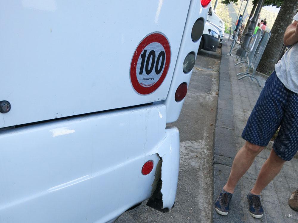 Als nach 20 Minuten klar wird, dass es aufgrund der Autoschlangen kein Zurück gibt, tauschen die Fahrer ihre Versicherungsdaten aus und der Busfahrer nimmt sich ein Herz und fährt. Ein ohrenbetäubendes Getöse hebt an, Metall verbiegt sich, Lack splittert ab und die vorwiegend nordeuropäischen Businsassen schreien kurz auf. Mit stoischer Ruhe nimmt der Fahrer die Zerstörungen zur Kenntnis und nach einer halben Minute bewegen sich die Kolonnen wieder. In Ravello werden die Touristen später die Spuren der Zerstörung mit ihren Kameras begeistert dokumentieren.
