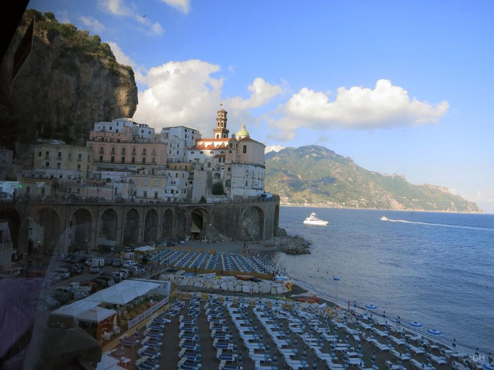 Fahren wir nach Amalfi! Wir waren zu Mittag von Sorrent mit dem öffentlichen Bus Richtung Amalfi losgefahren. Nachdem der Bus zuerst die Hügel rund um Sorrento durchquert hatte, kehrte er etwa eine halbe Stunde später zur Küste zurück. Bereits die ersten Kurven der legendären Strada Statale 163 Amalfitana versetzen die Fahrgäste abwechselnd in Staunen und Schrecken. Immer wieder fallen die Felsen entlang der Straße hunderte Meter in die Tiefe und geben den Blick auf das glitzernde Meer frei. Schwindelgefühl macht sich breit, während der offenbar ortskundige Chauffeur zügig und risikofreudig die wunderschöne Küste entlangbraust.