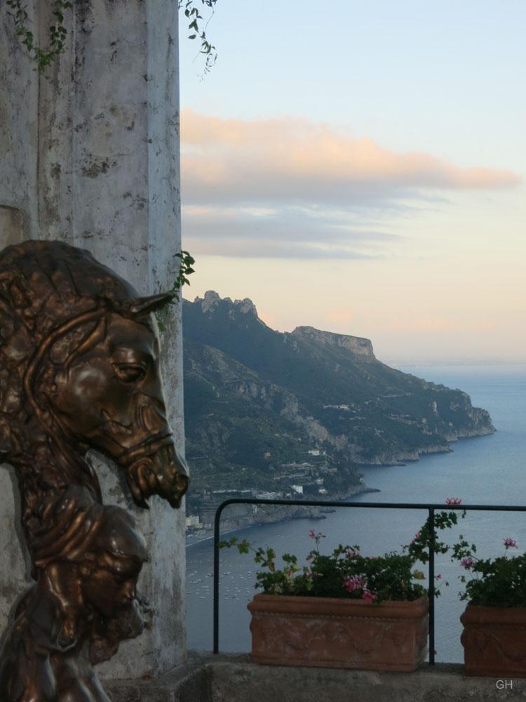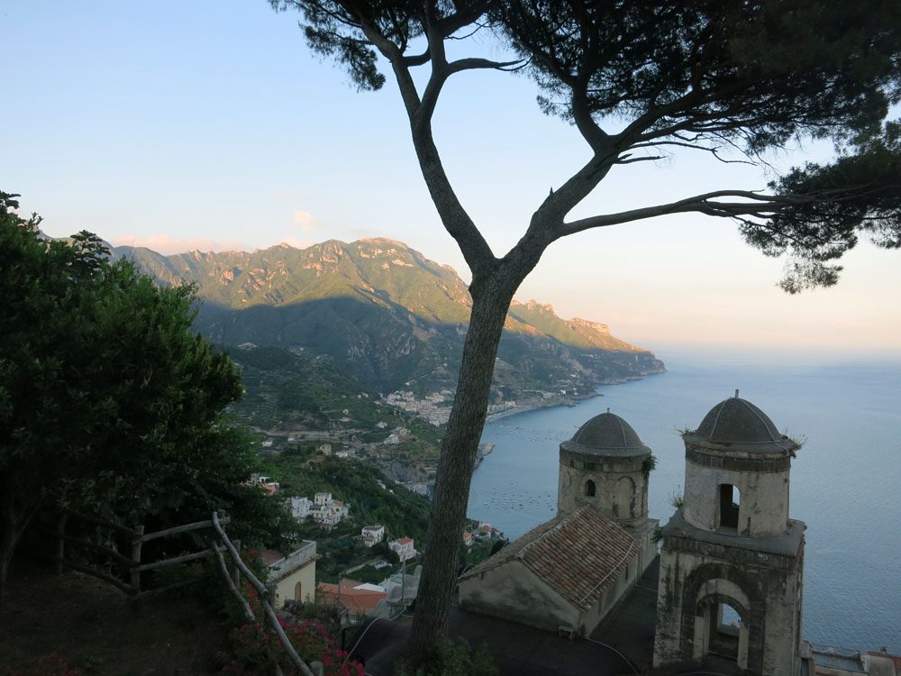 Ravello. Am frühen Abend sind wir endlich an unserem Ziel angekommen. Hoch über dem Meer thront das kleine Arkadien in den Bergen der Monti Lattari. Der gewaltige Ausblick, den man hier von den Gartenterrassen der Villa Rufolo bzw. der Villa Cimbrone genießen kann, wurde schon in den 1950er Jahren durch den Film Beat the Devil (Schach dem Teufel) mit Humphrey Bogart und Gina Lollobrigida weltberühmt. Das Chaos der Hinfahrt ist schnell vergessen, der autofreie Ort strahlt trotz der zahlreichen Touristen eine unglaubliche Ruhe aus.