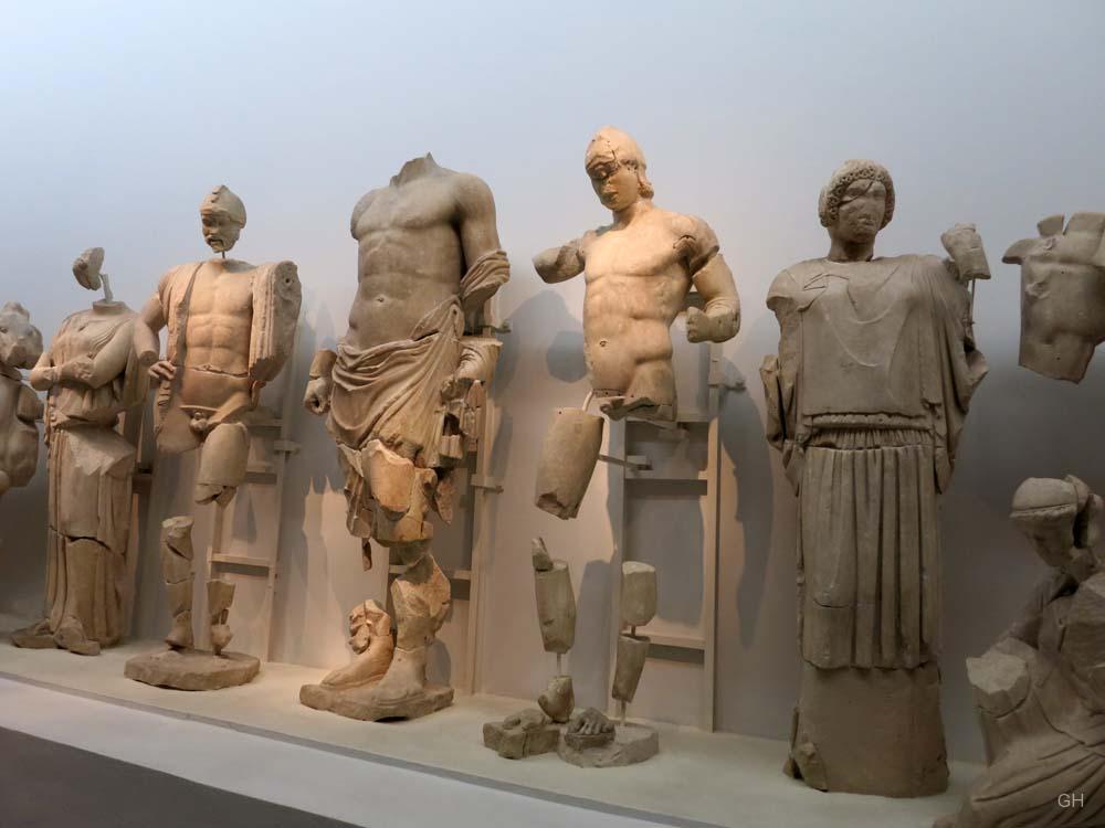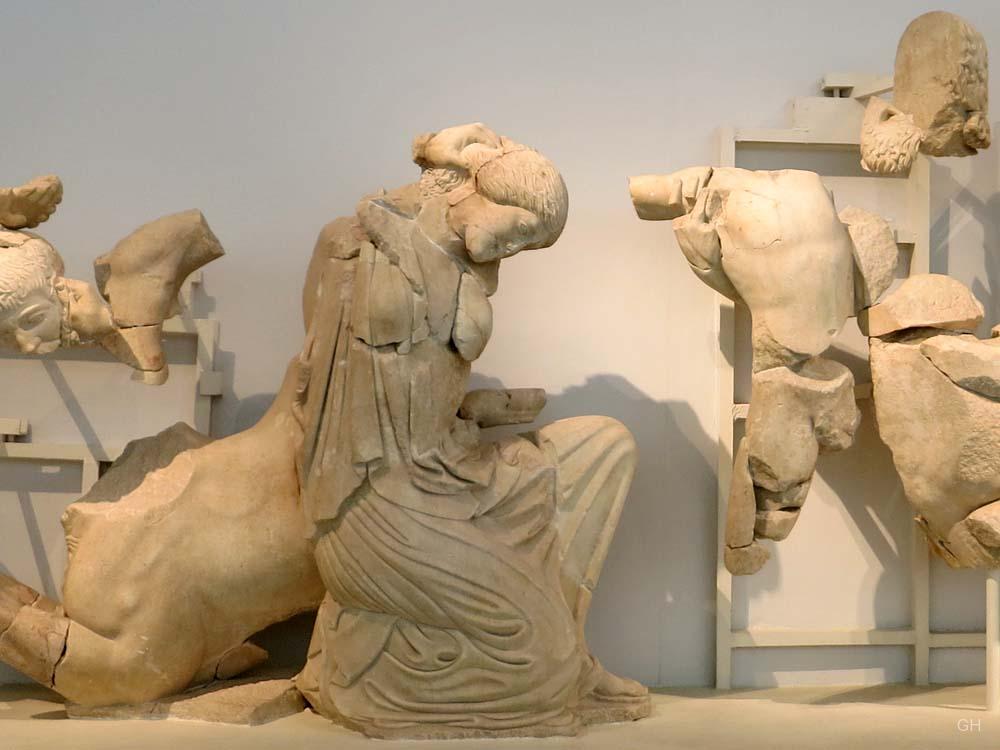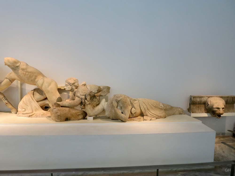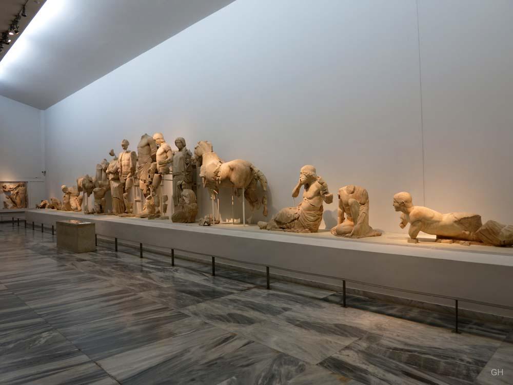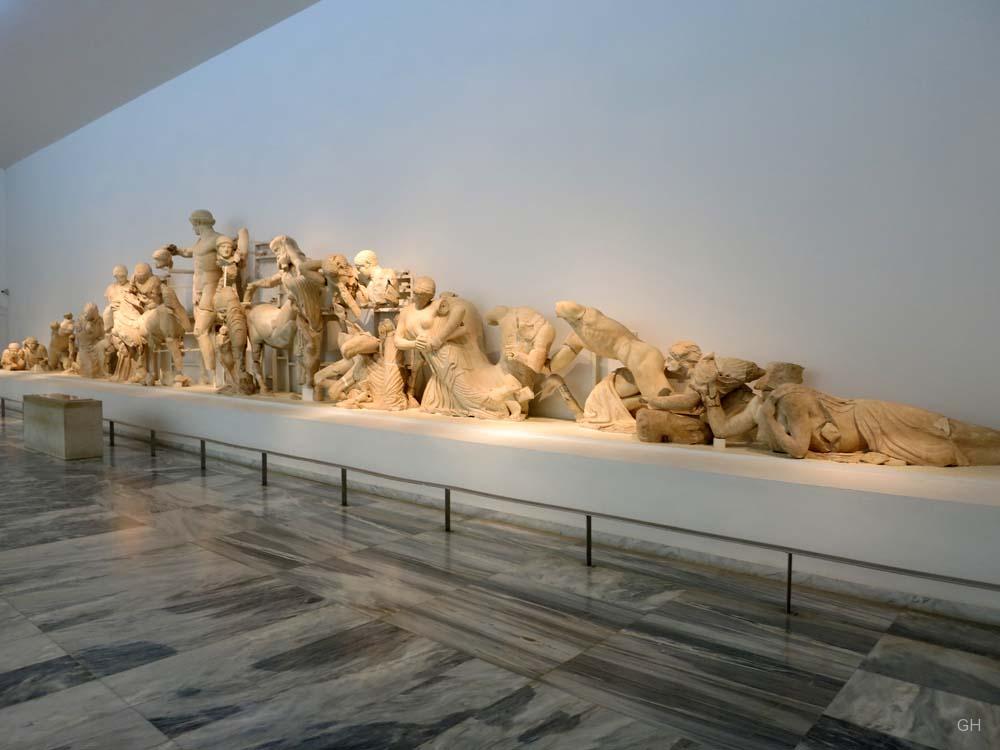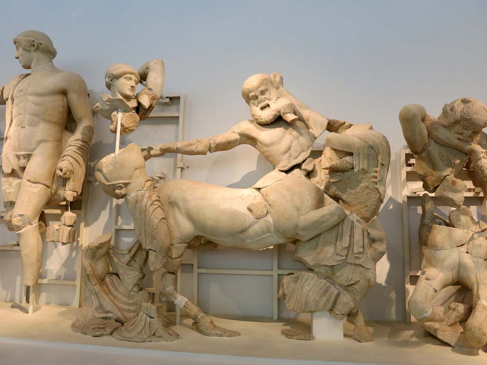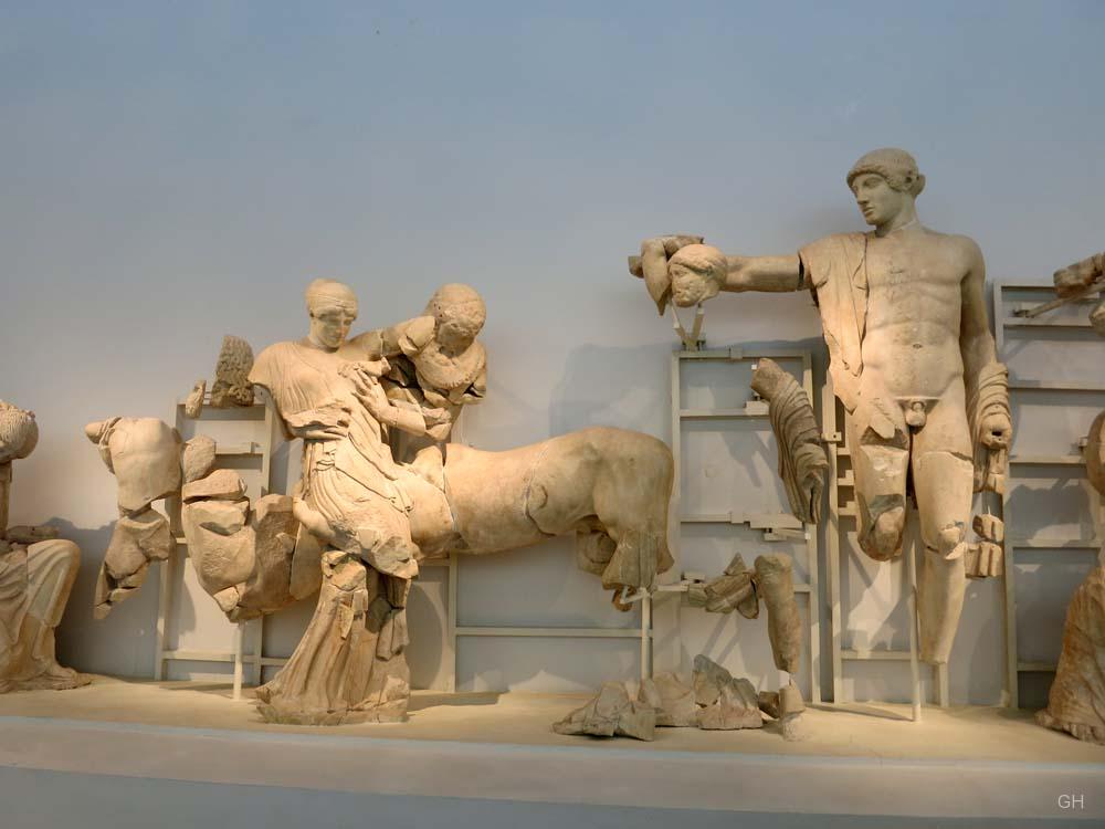 Der Anblick ist beeindruckend. Eingetaucht in das Licht der Scheinwerfer sind die beiden gewaltigen Friese des ehemaligen Zeustempels sogleich nach Betreten des Museums von Olympia zu sehen. Während der elegante Fries des Ostgiebels das Wagenrennen des Pelops gegen Oinomaose zum Thema hat und einen ruhigen beinahe statischen Eindruck vermittelt, tobt im Fries des Westgibels eine Schlacht zwischen Menschen und Kentauren. Lebendig und dynamisch folgt die Kampfszene der Form des Tympanons in einer Perfektion, die man bei anderen Bauwerken vergeblich sucht (Bsp.: Aphaiatempel, Arte Italiana, 196). Während zahlreiche Museumsbesucher gebannt auf das Schlachtengetümmel an der Wand starren, stellt sich dem Betrachter bald die Frage nach den Hintergründen dieser Schlacht.